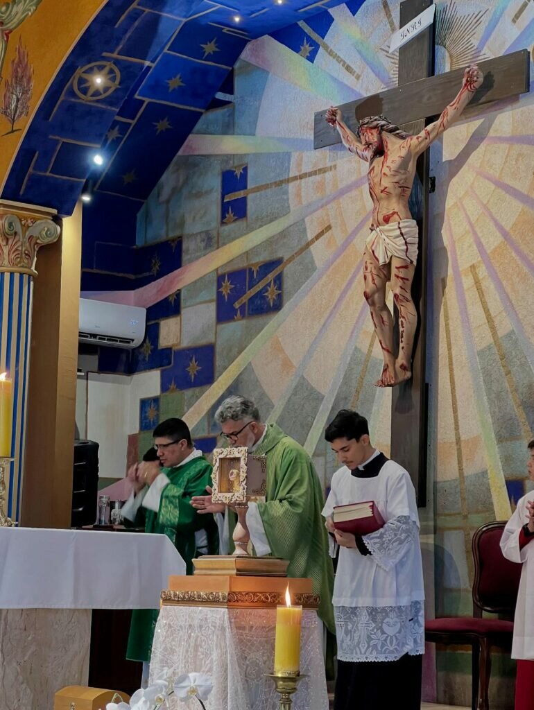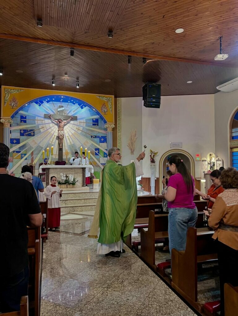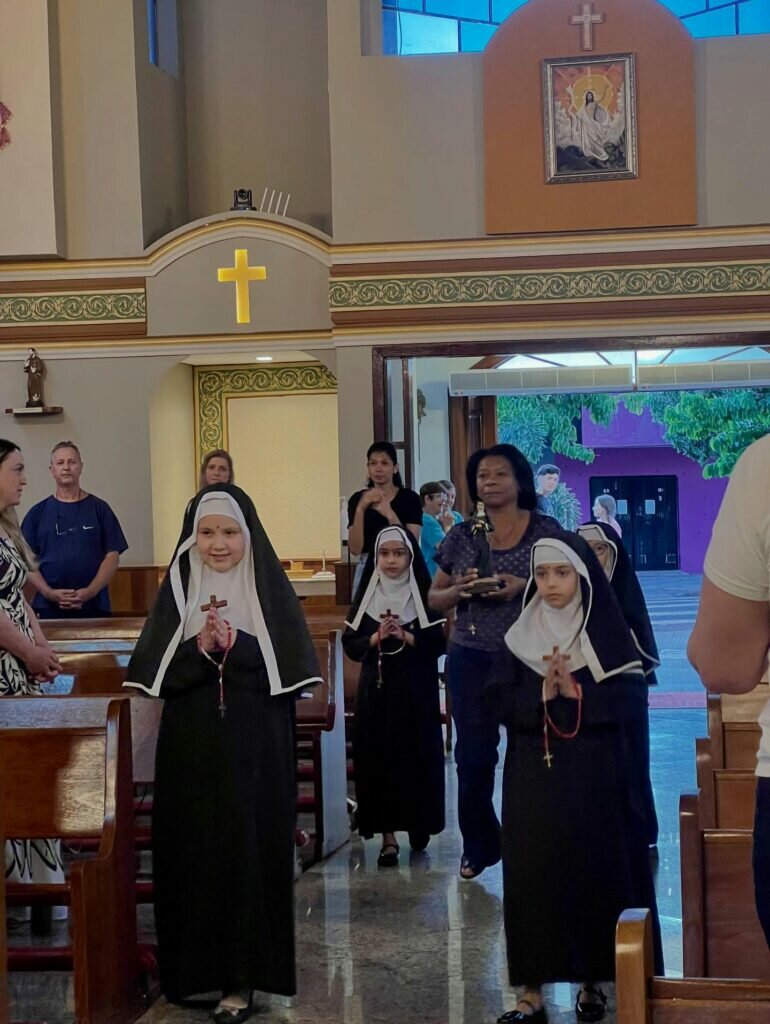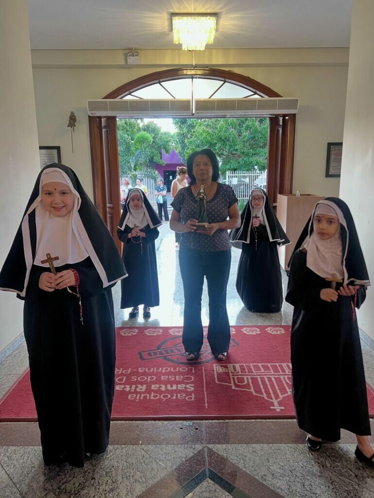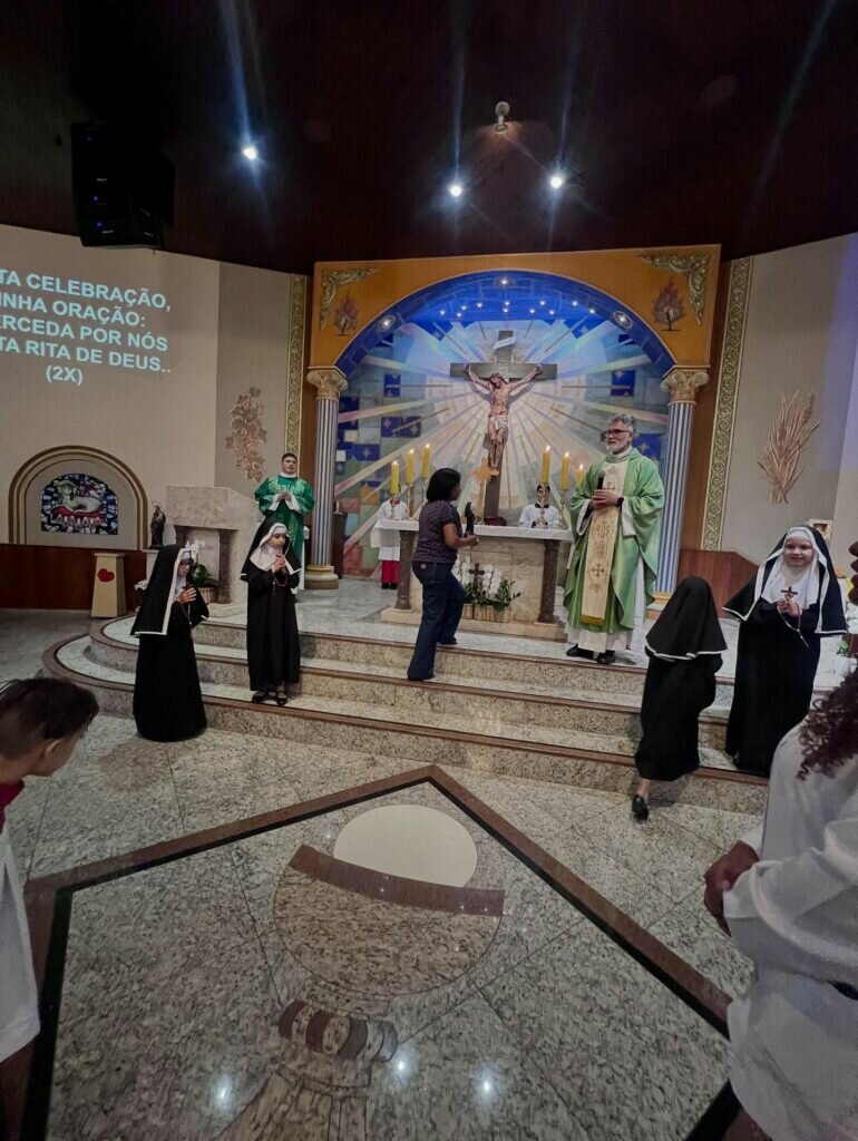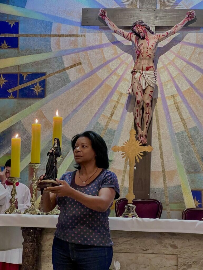 Na Missa do Romeiro de hoje, celebrada pelo padre Humberto, tivemos a alegria de acolher a benfeitora Heloísa, da Paroquia Nossa Senhora da Piedade, que com devoção trouxe em procissão a imagem de Santa Rita de Cássia.
