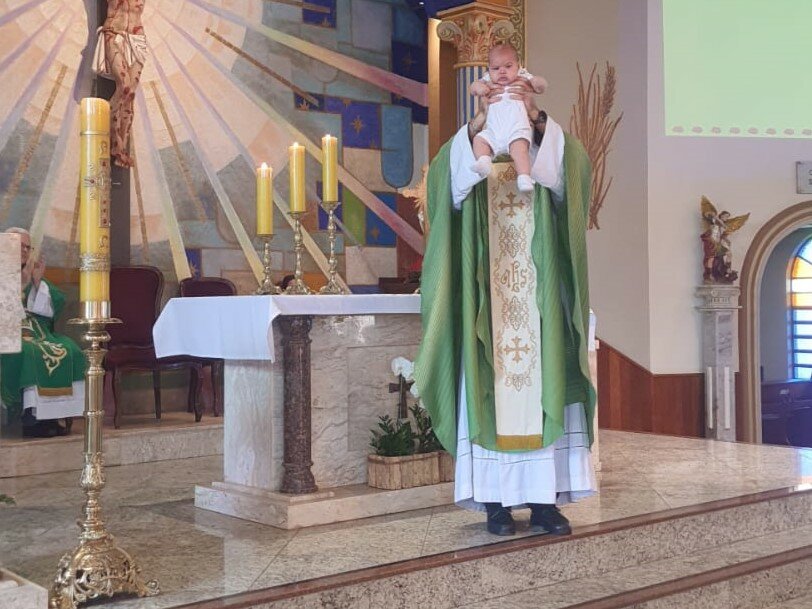 Na Santa Missa das 10h deste domingo, 28 de setembro, presidida pelo Pe. Humberto Lisboa, foi realizado o Sacramento do Batismo de cinco crianças. Em uma celebração marcada pela emoção, o sacerdote conduziu o rito com carinho e atenção, envolvendo as famílias e a assembleia em um verdadeiro espírito de comunhão.